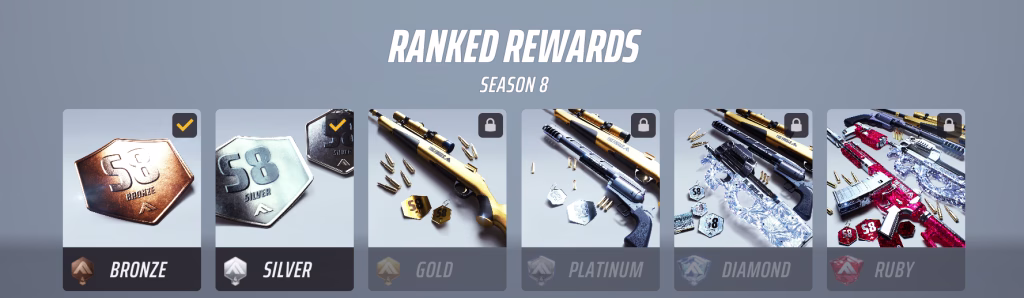 As you can see from the official Season 8 reward track, the journey from Bronze to Ruby is paved with increasingly exclusive loot. The real prizes begin at the Gold tier, introducing a series of stunning weapon skins that serve as the ultimate status symbols in the arena. Let’s take a closer look.